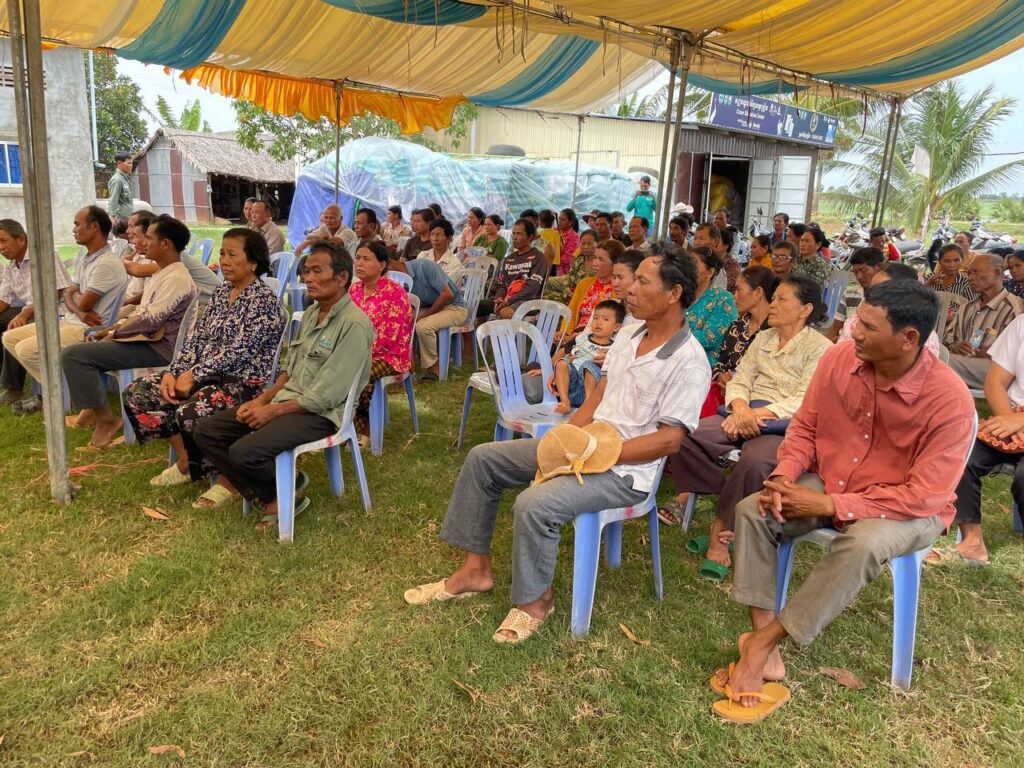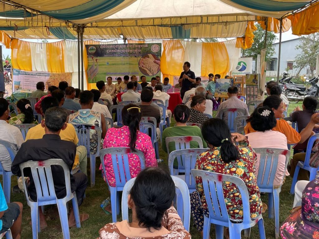 On June 4, 2025, NatureLife Cambodia (NLC) organized a seed and organic fertilizer distribution event for 142 Crane Rice farmers. The event took place at the Crane Rice storage facility in Koh Chamkar village, Boeung Sala Khang Tboung commune, Kampong Trach district, Kampot province.